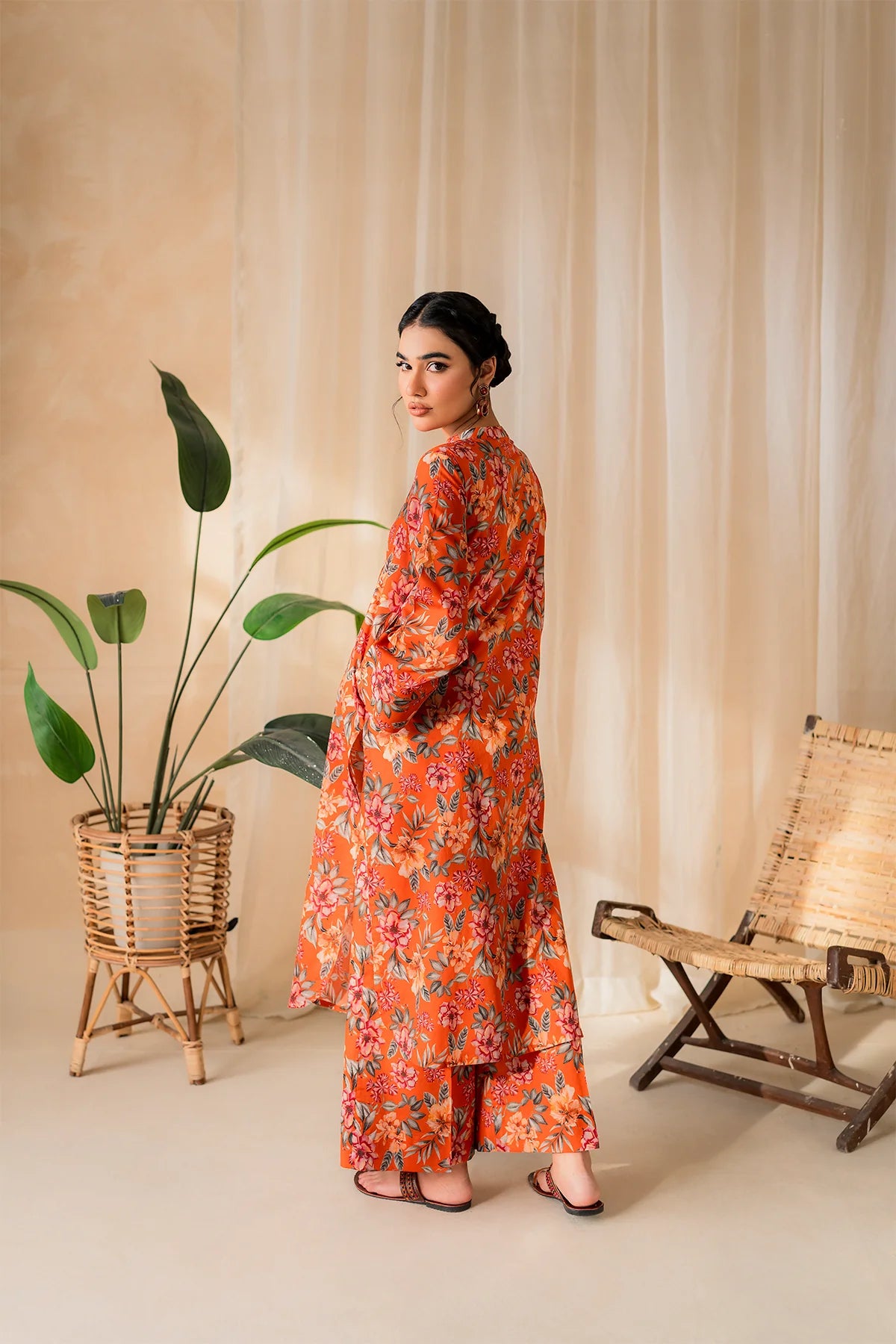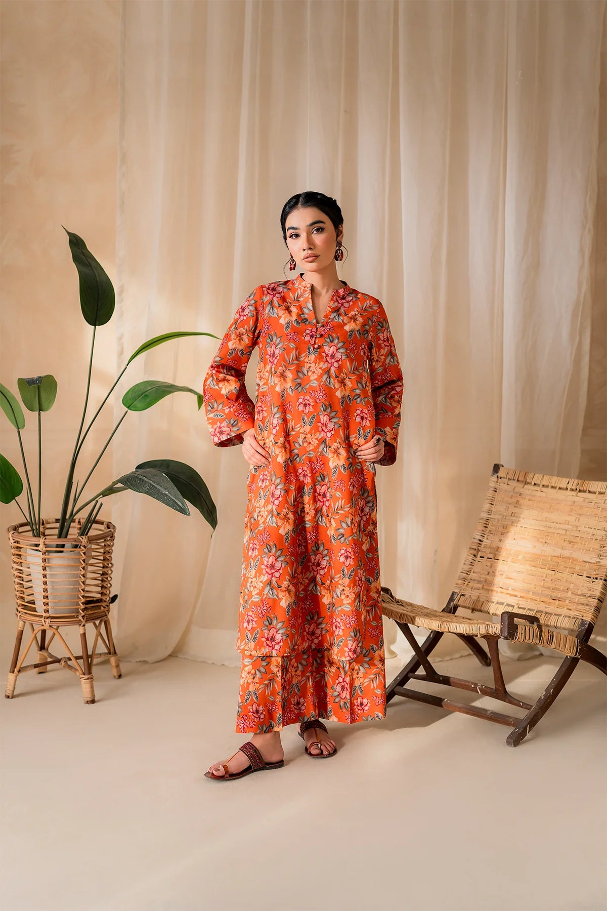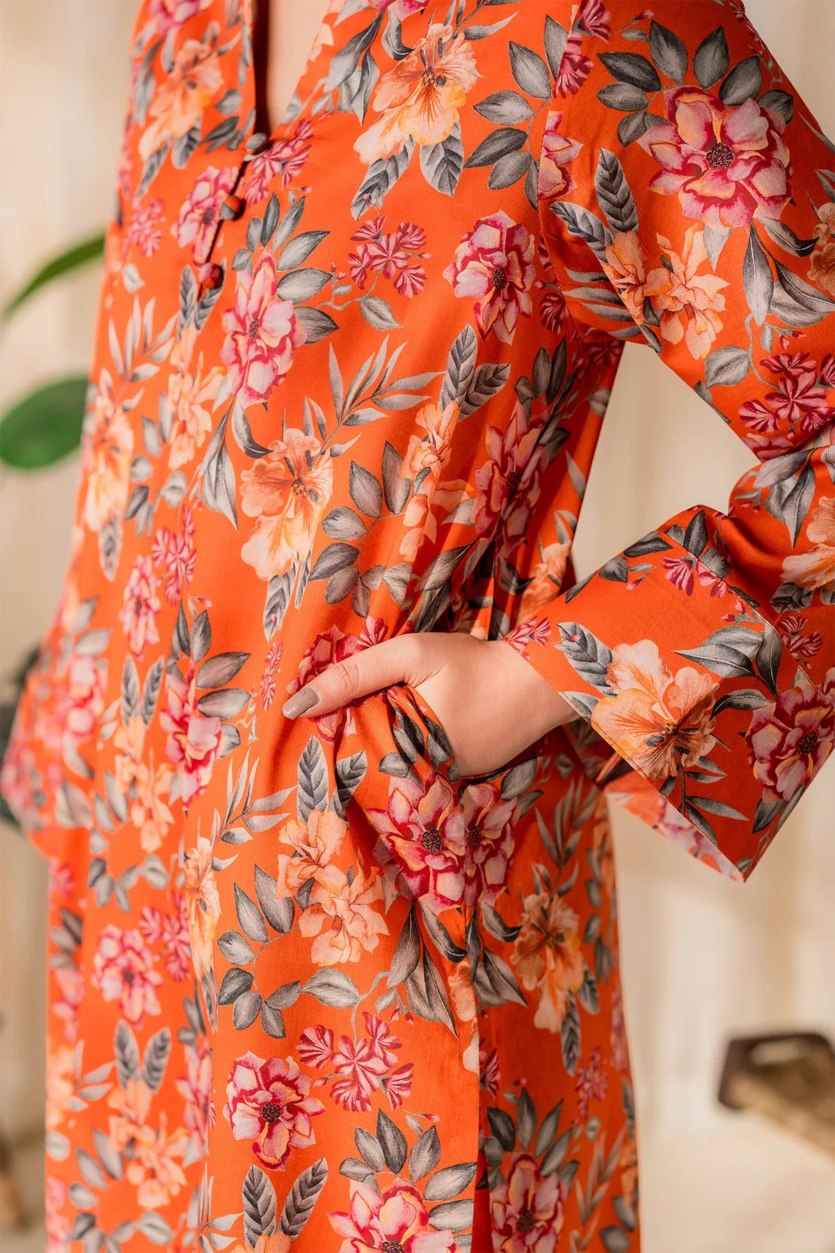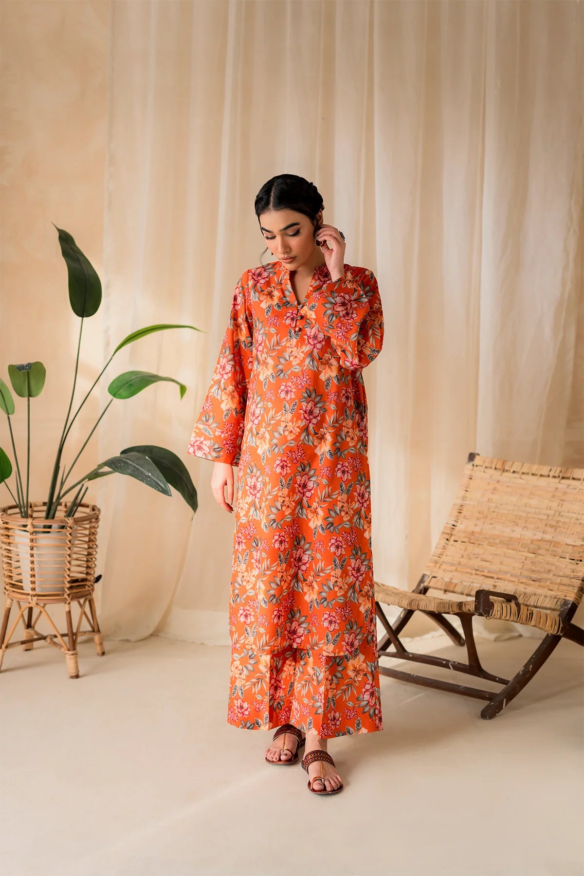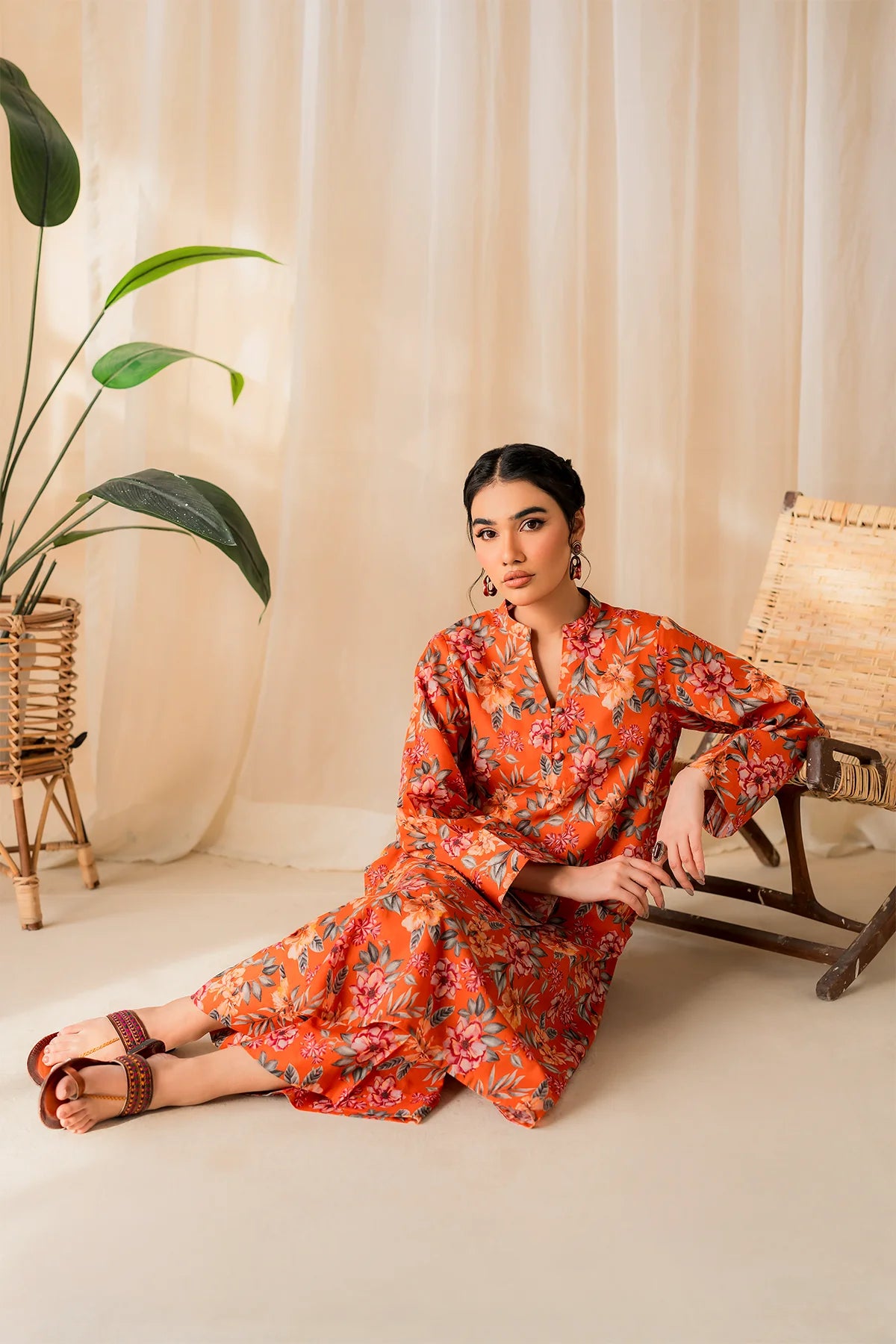 The rich rust hue sets the stage for the delicate floral color patterns, reminiscent of a blossoming garden in full bloom. This vibrant print is like a burst of sunshine on a warm summer day, offering both style and comfort in spades.